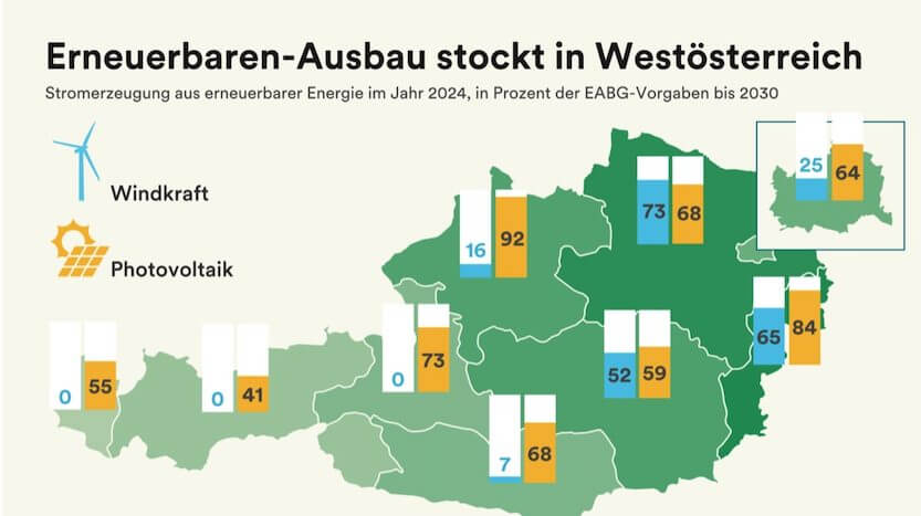 Deutlich verhaltener fällt die Bilanz im Westen aus: Salzburg, Tirol und Vorarlberg stehen bei der Windkraft weiterhin bei null Prozent ihres jeweiligen Zielwerts. Bei der Photovoltaik kommt Tirol lediglich auf 41 Prozent. Der Ausbau der erneuerbaren Energien verläuft damit regional höchst unterschiedlich – und stockt vor allem in Westösterreich spürbar.