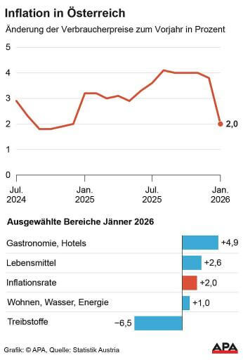 Die Teuerung in Österreich hat sich zu Jahresbeginn spürbar abgeschwächt. Im Jänner 2026 stiegen die Verbraucherpreise im Jahresvergleich um 2,0 Prozent, wie aus Daten von Statistik Austria hervorgeht. Damit bestätigte sich die Schnellschätzung von Anfang des Monats exakt. Im Dezember hatte die Inflationsrate noch bei 3,8 Prozent gelegen. Im Vergleich zum Vormonat sank das durchschnittliche Preisniveau im Jänner 2026 um 0,7 Prozent, wie die Behörde am Mittwoch in Wien bekannt gab.
