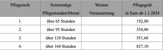 Die Pflegestufen sind die Leitlinien für die Unterstützung, die jede Person erhält, basierend auf dem Grad ihrer Pflegebedürftigkeit. Von geringfügiger Unterstützung bis hin zu intensiver Betreuung deckt jedes Level einen spezifischen Bedarf ab und ist mit einem entsprechenden Geldbetrag verbunden.