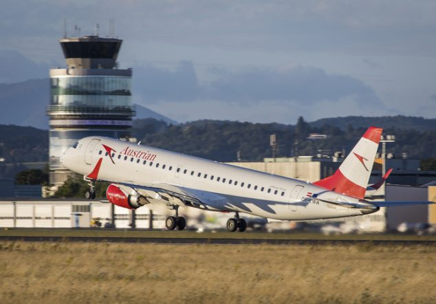 Austrian Embraer 195 ab Flughafen Graz mit dem Flugsicherungsturm im Hintergrund GETTYIMAGES/Photofex-AT