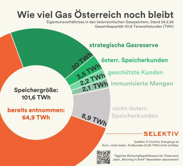 Ein weiterer Teil des gespeicherten Gases gehört österreichischen Unternehmen und Energieversorgern. Rund 3,5 TWh sind laut Regulierungsbehörde E-Control von heimischen Speicherkunden eingelagert und dürften überwiegend für den österreichischen Markt vorgesehen sein.