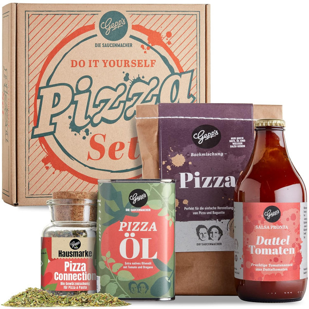 Gepp’s Feinkost DIY Pizza Geschenkset I Knusprige und leckere Pizza zum Selbermachen I Geschenk mit Pizzateig nach neapolitanischer Art, Sugo aus Kirsch- und Datteltomaten, Pizzaöl und Biopizzagewürz