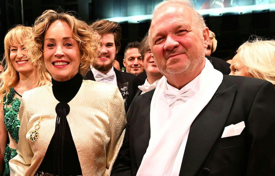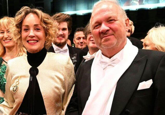Sharon Stone, die ihren Sohn Laird mitnimmt, kommt in einer Robe von Valentino im Klimt-Design in die Oper. Vorfahren wird sie gemeinsam mit ihrem Gastgeber, “Schaumrollenkönig” Karl Guschelbauer, in zwei Bentleys.