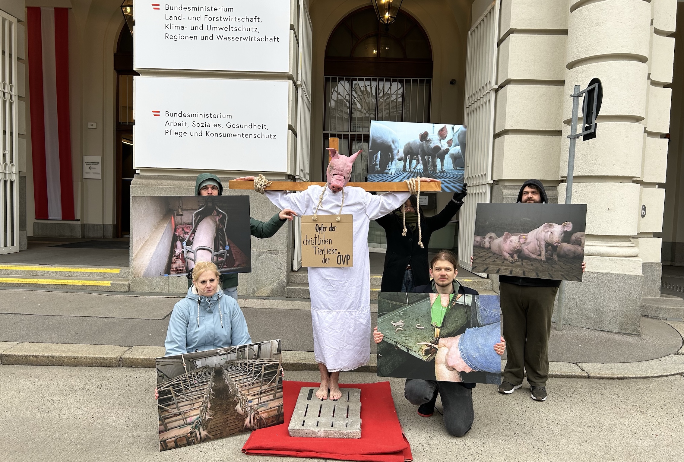 Besonders brisant: Statt einer Christusfigur zeigen die Aktivisten eine Gestalt mit Schweinemaske, die das Kreuz schleppt – eine unübersehbare Anspielung auf Jesus. Dazu ein politisches Schild: „Opfer der christlichen Tierliebe der ÖVP“.