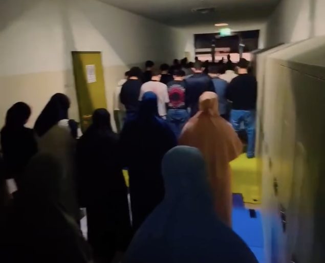 Das Muster ist offenbar nicht neu. Schon im Vorjahr veröffentlichte derselbe Schüleraccount ein weiteres Video zu einem Fastenbrechen. Auch dort knieten Schülerinnen, teils stark verhüllt, hinter den Schülern – diesmal nicht im Turnsaal, sondern im Schulgang.