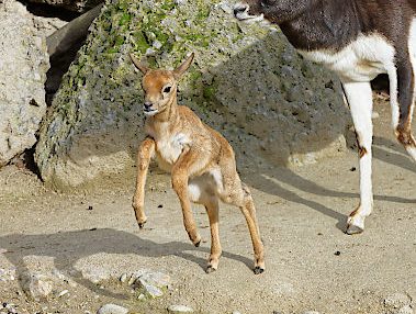 Die Hirschziegenantilope wird laut Angaben des Tiergartens wegen der dunklen Färbung des Rückens bei männlichen Tieren auch Schwarzbock genannt, Weibchen und Junge sind jedoch sandfarben. Während die Weibchen hornlos sind, fallen Männchen durch ihre großen, schraubenartig gewundenen Hörner auf.