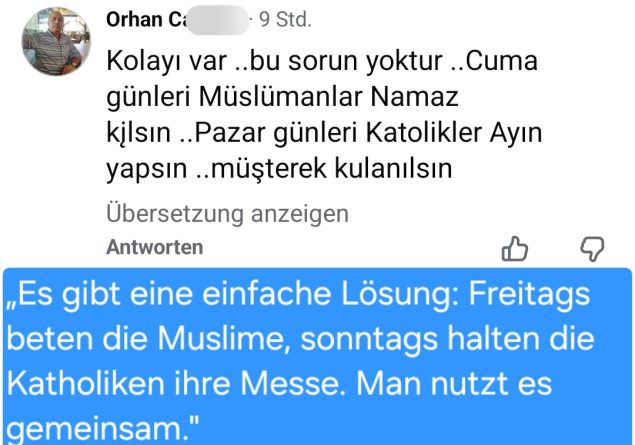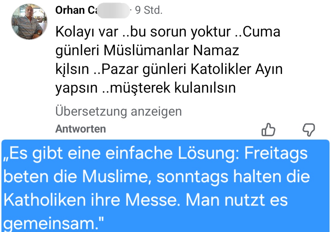 Nicht alle Türken ticken freilich so eroberungslustig wie jene, die in der Umwandlung der Hagia Sophia, der ehemals christlichen Kirche in Istanbul, in eine Moschee einen Handlungsauftrag von Staatschef Recep Tayyip Erdogan für ähnlich Aktivitäten in der türkischen Diaspora sehen. In die Debatte auf der türkischen Plattform mischen sich auch nachdenklichere Stimmen. Ugur K. rät den vom Kirchenkauf träumenden Glaubensgenossen, ihre Meinung für sich zu behalten. „Wenn man dort eine Moschee baut, würde die Bevölkerung rebellieren“, ist sich K. sicher und hat eine bessere Idee: „Die Türken dort sollen Geld sammeln und es der Gemeinde geben, damit die Kirche wieder eröffnet wird.“ Auch Ilhan Imam Ö. fände es gar nicht abwegig, Christen von der muslimischen Spendenpflicht (Zakat) profitieren zu lassen: „Wäre es nicht attraktiver, die Kirche zu unterstützen und ihr zu helfen?“ Mustafa S. hält davon gar nichts. Da das Christentum „sowieso eine falsche, erfundene und verfälschte Religion“ sei, gibt es für ihn nur diese Option: „Lasst uns die Kirche kaufen und zur Moschee machen.“ Dem stellt Muhammet K. eine Salomonische Lösung gegenüber: „Ganz einfach: Man beteiligt sich gemeinsam an den Kosten und nutzt einen Teil als Kirche und einen Teil als Moschee. Schließlich sind beide wahre Religionen.“