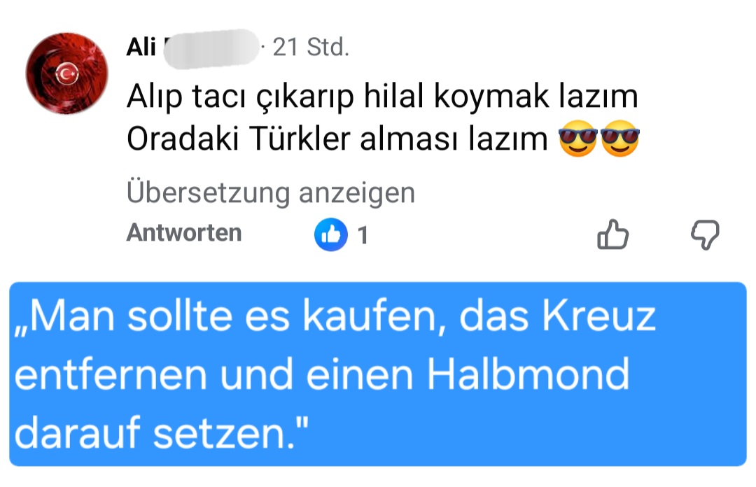 Mustafa S. ruft die Islam-Vereine in Österreich auf, sofort Kontakt mit der Pfarre aufzunehmen, zu „kaufen und in eine Moschee umwandeln”. Halil T. ist gegen einen Kauf, weil das Kreuz und die Dinge im Inneren der Kirche nicht mit dem Islam vereinbar seien. Dafür aber hat Ali B. eine Lösung: Die Türken sollten die Kirche kaufen, „das Kreuz entfernen und einen Halbmond darauf setzen”.