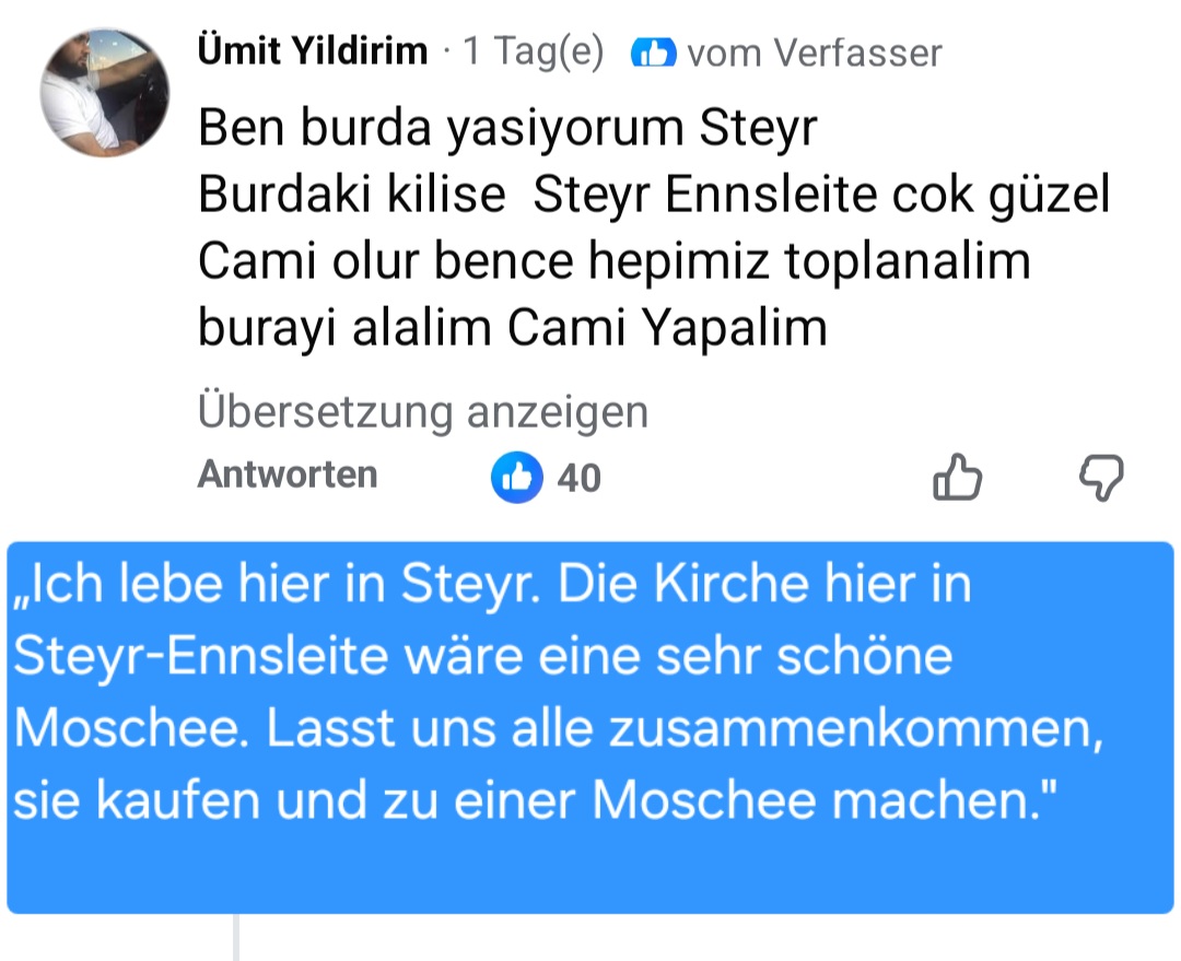 Dass ob der Verkaufsentscheidung „allen das Herz blutet“, hat der Seelsorger wirklich gesagt. Dass es allen so geht, stimmt aber auch nicht ganz. Ümit Y., ein in der Eisenstadt lebender Türke träumt nicht alleine, wenn er schreibt: „Die Kirche hier in Steyr-Ennsleite wäre eine sehr schöne Moschee. Lasst uns alle zusammenkommen, sie kaufen und zu einer Moschee machen.“
