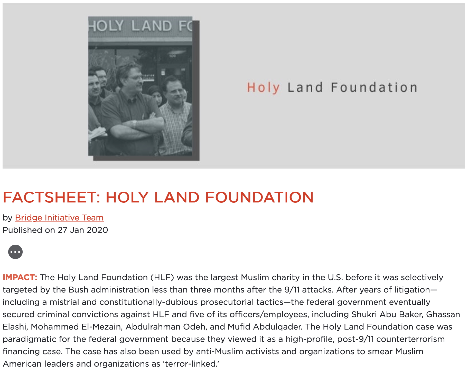 Besonders aufschlussreich ist hier ein mittlerweile gelöschtes Factsheet der Bridge Initiative zur Holy Land Foundation. Darin wird die NGO als verfolgte muslimische Hilfsorganisation und als Opfer von Islamophobie dargestellt. Die Verurteilungen seien erst nach „verfassungsrechtlich fragwürdigen Anklagemethoden“ zustande gekommen.