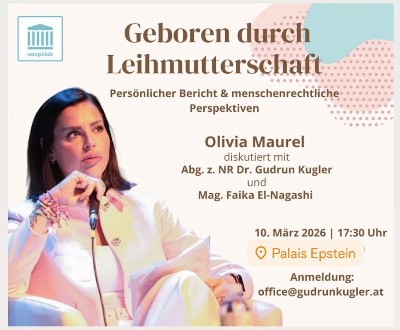 Auf Einladung von ÖVP-Abgeordneter Gudrun Kugler sprechen die Autorin und Sprecherin der Casablanca Deklaration Olivia Maurel, die ehemalige Nationalratsabgeordnete der Grünen und Direktorin des Athena Forums Faika El-Nagashi und das Publikum über Leihmutterschaft, Menschenwürde und einen global wachsenden Markt rund um Fortpflanzung.
