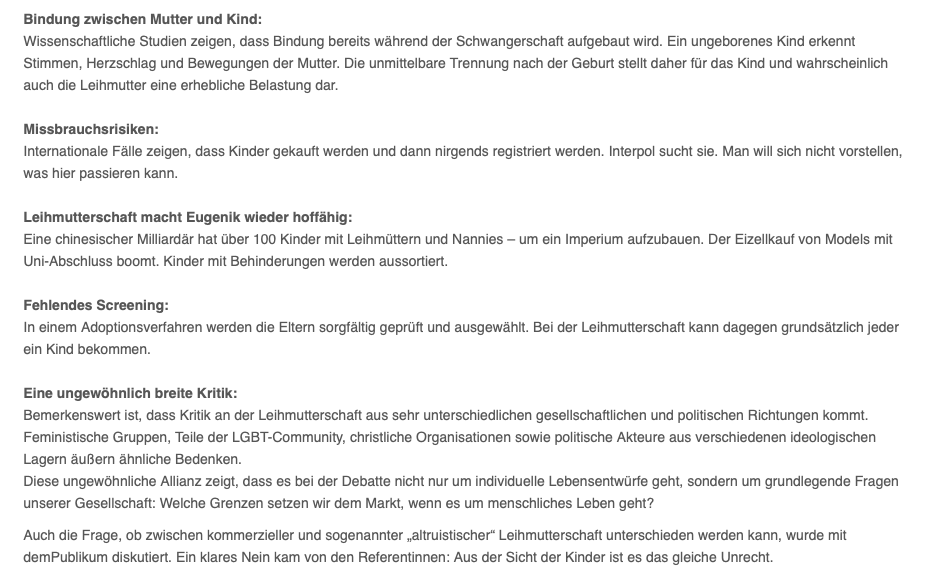 El-Nagashi warnt zudem davor, dass Leihmutterschaft häufig über andere politische Debatten legitimiert werde. Sie zitiert eine öffentliche Stellungnahme von Amnesty International, in der betont wird, dass reproduktive und körperliche Autonomie auch das Recht einschließen könne, sich freiwillig für eine Leihmutterschaft zu entscheiden. Gestationelle Leihmutterschaft, heißt es darin, sei für viele Menschen eine Möglichkeit der Familiengründung und dürfe nicht grundsätzlich mit Gewalt gegen Frauen oder Kinderhandel gleichgesetzt werden. Diese Positionierung unterschiedet sich von jener der Diskutantinnen an diesem Abend.