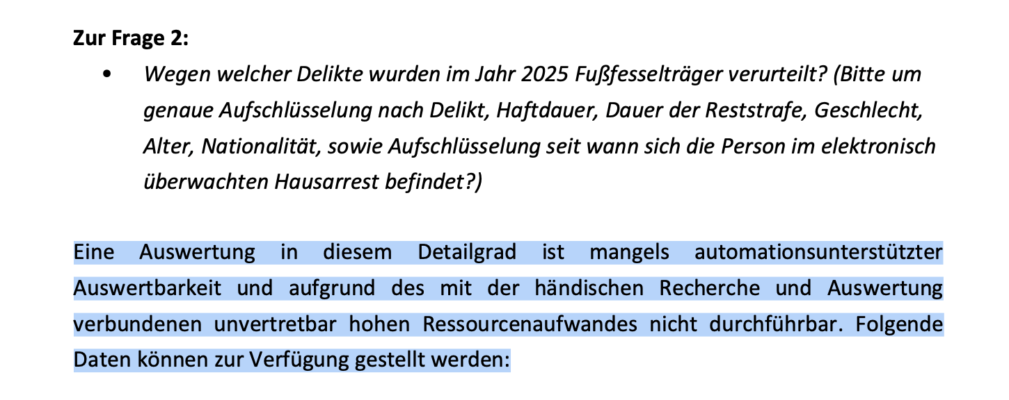 Die Anfrage zeigt auch ein grundlegendes Problem: Viele entscheidende Daten liegen gar nicht vor. Das Justizministerium kann etwa nicht genau auswerten, bei welchen Delikten die Fußfessel eingesetzt wird oder in welchen Fällen es besonders häufig zu Abbrüchen kommt. Begründet wird das damit, dass entsprechende Auswertungen nicht automatisiert möglich seien und der Aufwand zu hoch wäre. Damit bleibt letztlich offen, bei welchen Tätergruppen der elektronische Hausarrest tatsächlich funktioniert – und wo er scheitert.