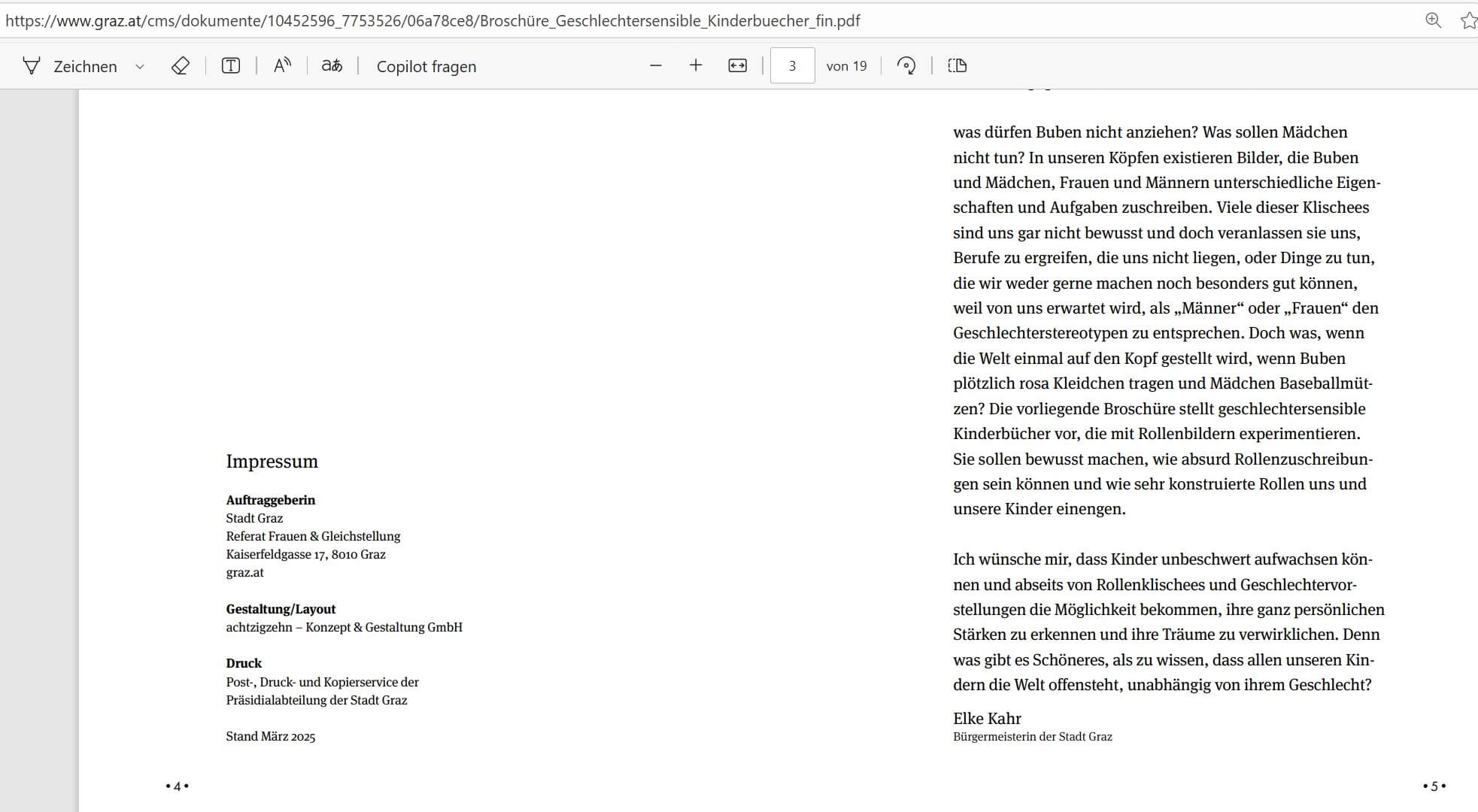 Anlässlich des „Internationalen Weltmädchentags“ am 11. Oktober präsentierte Grazer Bürgermeisterin Elke Kahr (KPÖ) gemeinsam mit dem Referat Frauen & Gleichstellung sowie der Stadtbibliothek eine neue Broschüre mit dem Titel „Geschlechtersensible Kinderbücher“. Damit unterstützt die Stadt Graz aktiv eine Auswahl an Kinderbüchern, in denen etwa männliche Meerjungfrauen als Beispiele für „moderne Rollenbilder“ dienen sollen. Rund 300 Kinderkrippen, Kindergärten, Horte und alle Grazer Volksschulen erhielten diese Broschüre samt Plakat kostenlos zugesandt – auf Initiative der Stadtverwaltung.