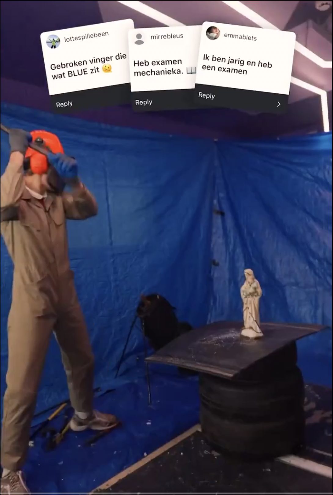 De Roo antwortet: „Wir sind alle mit christlichen Traditionen aufgewachsen, deshalb ist das Zerschlagen einer Jesus-Statue auch eine Art, uns selbst auf die Schippe zu nehmen”. Deshalb sei das Zertrümmern der Statuen eine Art „über sich selbst lachen“. Das würde sie mit anderen Religionen nicht machen.