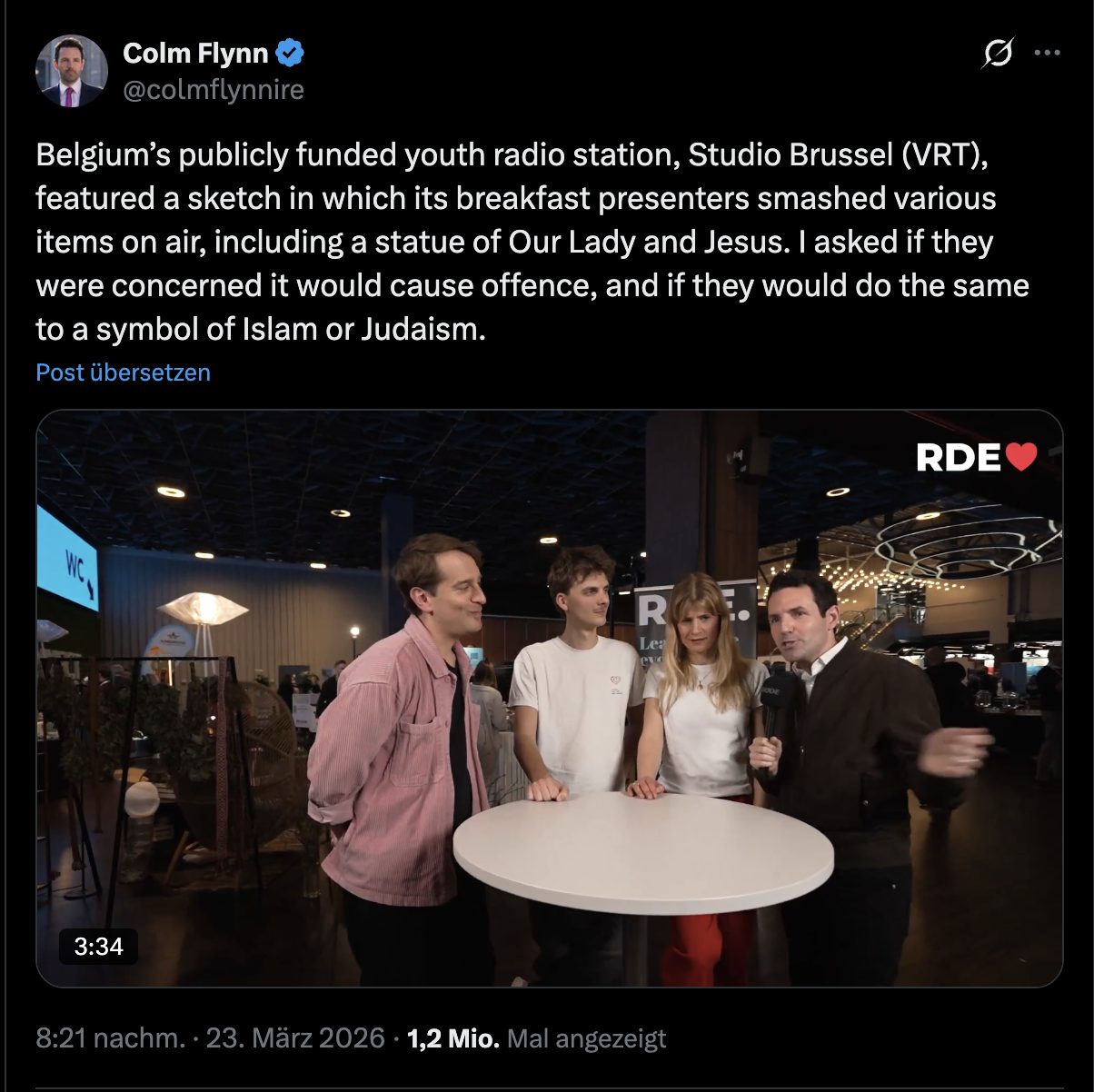 Flynn fragte die zuständigen Moderatoren, ob sie nachvollziehen können, dass das Zerschlagen der heiligen Statuen die religiösen Gefühle vieler gläubiger Zuseher verletzte. „Das ist eine sehr gute Frage“, sagt Sam De Bruyn, leitender Produzent des öffentlich-rechtlichen Senders. „Es könnte Menschen verletzten, aber nicht in Belgien, weil es kein christliches Land mehr ist. Die Hörer von Studio Brussels verletzt es definitiv nicht“, erklärt er.