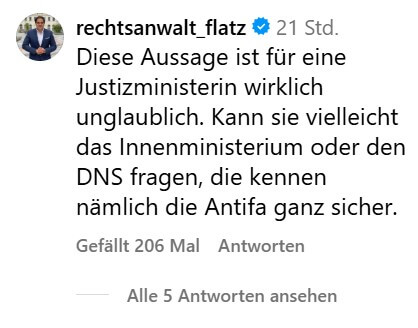 Er stellt auch klar: „Derzeit können daher nur Straftäter die im Namen der Antifa eine Straftat begehen, nach dem allgemeinen Strafrecht bestraft werden.“ Dennoch sei die Tatsache, dass Sporrer die Antifa scheinbar nicht kennt, ein schwerer Fehler, wie Flatz erklärt: „Was aber sehr befremdlich ist, dass eine Justizministerin sagt, dass sie die Antifa nicht kennt.“