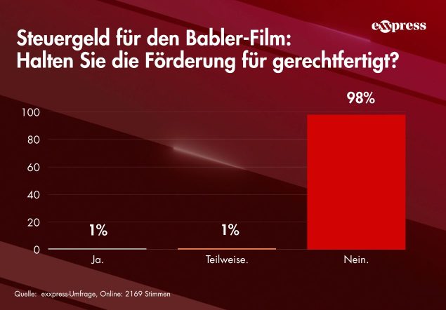 In einer aktuellen exxpress-Umfrage wollten wir von Ihnen wissen, ob Sie die Förderung für gerechtfertigt halten. An der Abstimmung beteiligten sich 2.169 Personen. Dabei äußerte eine deutliche Mehrheit (98 Prozent!) Kritik am Einsatz öffentlicher Mittel für Filme zu Politikern, während nur ein minimaler Teil der Teilnehmer diesen befürwortete.