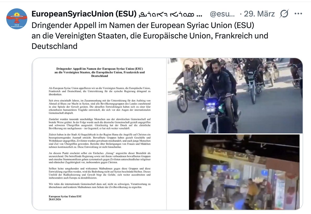 Auch die European Syriac Union (ESU), die sich für syrisch-christliche Minderheiten in Europa einsetzt, erhebt schwere Vorwürfe. In einer Stellungnahme heißt es: