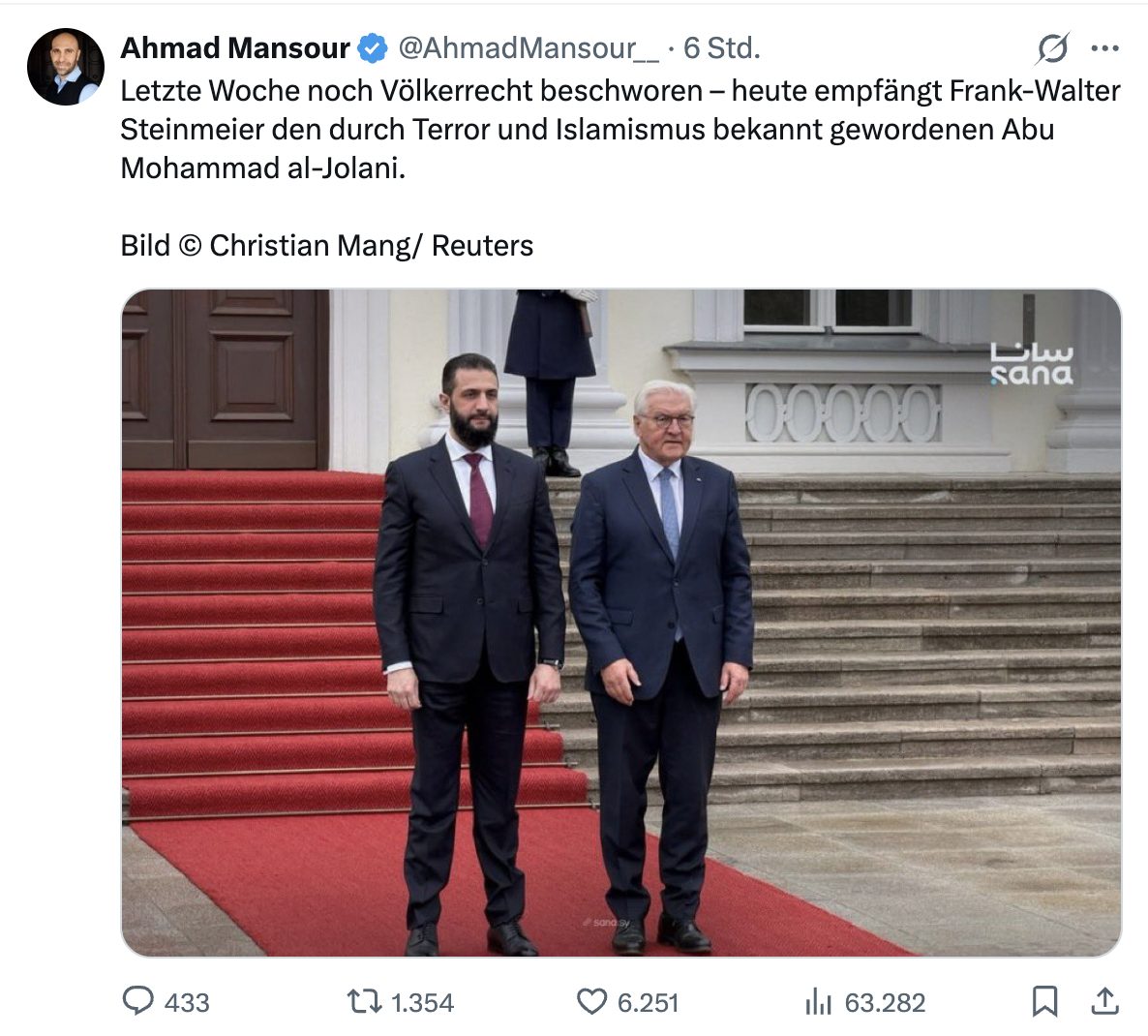 Der israelisch-deutsche Psychologe und Islamismus-Kritiker Ahmad Mansour kommentierte den Besuch auf X mit folgenden Worten: „Letzte Woche noch Völkerrecht beschworen – heute empfängt Frank-Walter Steinmeier den durch Terror und Islamismus bekannt gewordenen Abu Mohammad al-Jolani“. Abu Mohammad al-Jolani ist der Kampfname des syrischen Präsidenten aus seiner Zeit als HTS-Anführer.