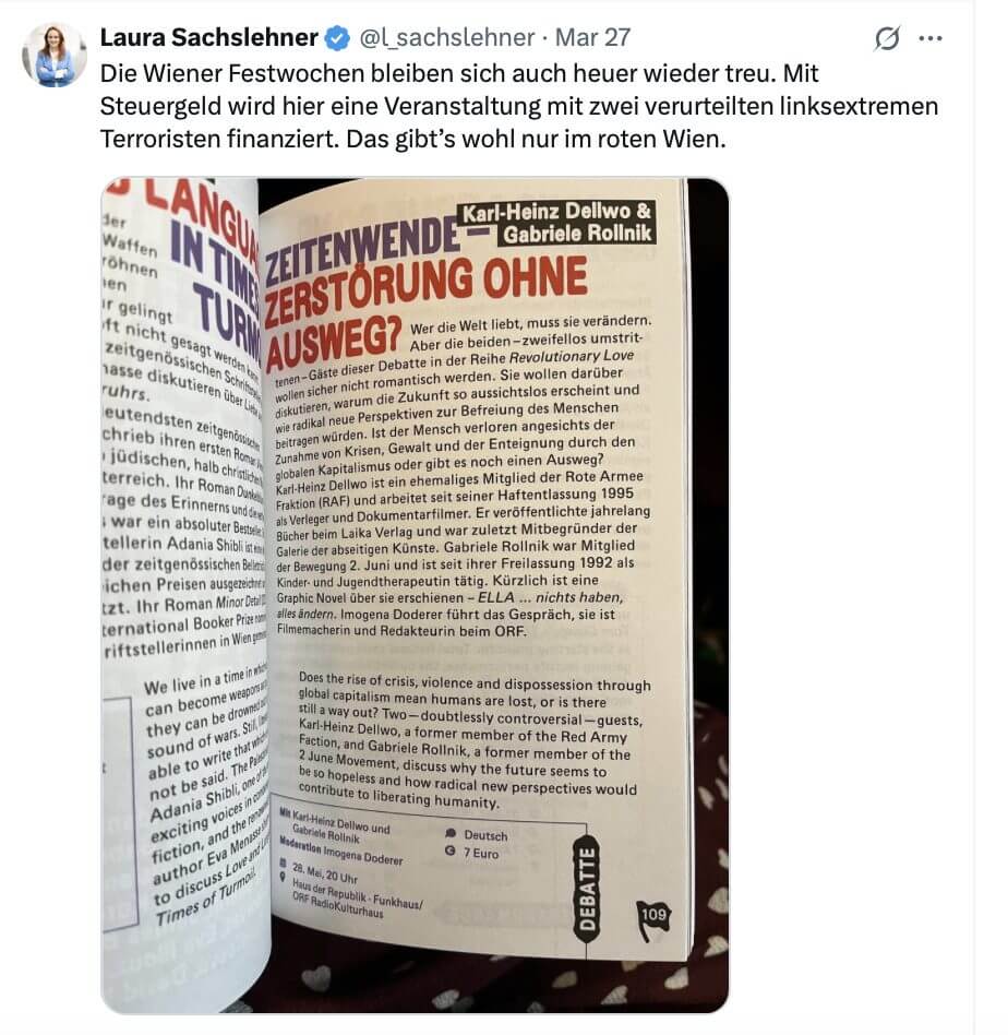 Am 28. Mai diskutieren bei den Wiener Festwochen zwei verurteilte linke Terroristen – finanziert mit Steuergeld. Karl-Heinz Dellwo (RAF) und Gabriele Rollnik (Bewegung 2. Juni) sprechen über „radikale Befreiung“. Kritik kommt bislang nur von Gemeinderätin Laura Sachslehner (ÖVP).