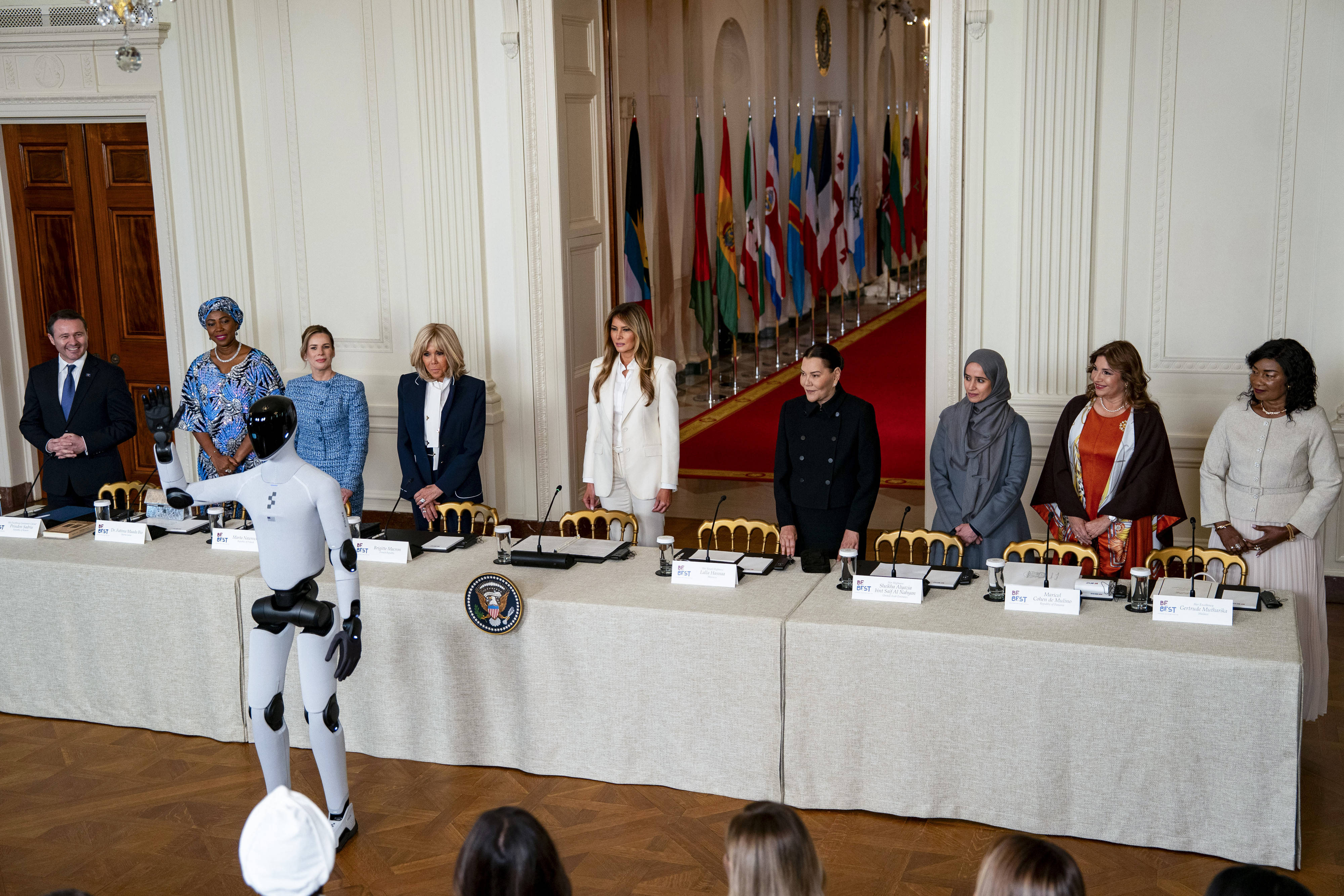 Bei einem ungewöhnlichen Auftritt im Weißen Haus hat First Lady Melania Trump gemeinsam mit einem humanoiden Roboter internationale Gäste, darunter auch die französische Präsidentengattin Brigitte Macron, empfangen. Anlass war der zweite Tag eines Gipfels zu Bildung und Technologie am Mittwoch.