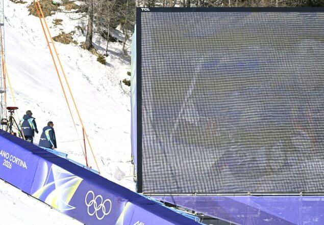 Der Sturz von Lindsey Vonn (USA) ist auf einem Bildschirm zu sehen, aufgenommen am Sonntag, 08. Februar 2026, im Rahmen der Abfahrt der Frauen in Cortina d'Ampezzo.APA/Hans Klaus Techt